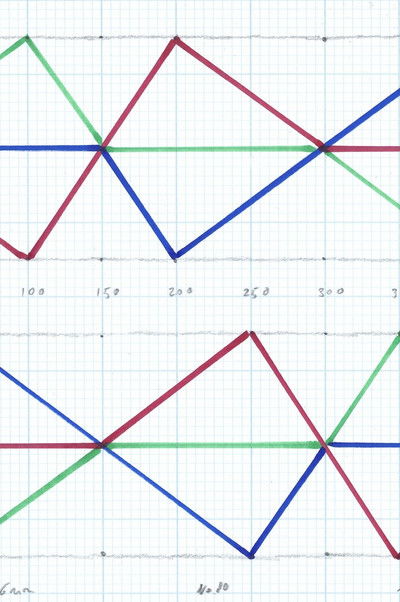 The Number Series uses double projection to create an uncanny experience of color as both presence and absence, a negation that is generative. In No. 10, symmetrical films emerge from and return to gray in an offset pattern. -MB