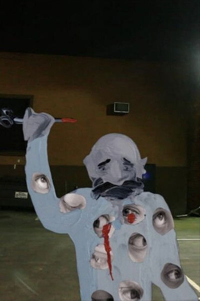 A man cuts holes in his clothes. Eyes grow all over his body.