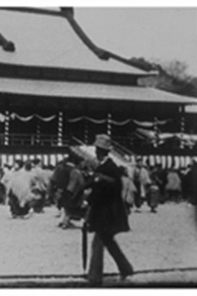 Rickshaws and pedestrians are moving in the street. Not to be confused with Constant Girel's "Une rue a Tokyo."