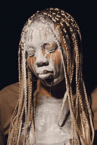 In this endless, silent loop, Martine Syms is seen in three-quarter profile against a plain black background. Framed from the chest up, wearing a brown t-shirt and with braided hair, the artist can be seen covered in milk. We see how it has poured down Syms’s face, hairline, braids, and torso. Its thick residue covering her clothes and skin. In the time it takes to draw breath and blink, the scene is looped, the only other sign of movement are the drips from her chin that fall and then repeat in a cycle that seemingly defies gravity. This powerful, almost still image reminds us that milk is often used by protestors to relieve the painful effects of tear gas.